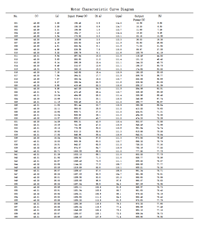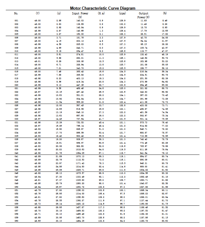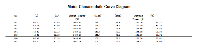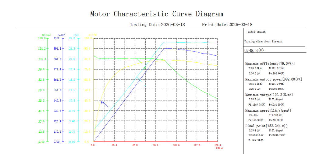 A quick note on how to read this data: The numbers below come from our independent laboratory motor characteristic curve tests. This is a rigorous test where the motor is loaded from zero to maximum torque while sensors continuously record everything. As with all lab data, your real-world mileage may vary slightly based on your specific battery, your controller settings, and how you mount it. Treat these numbers as a highly accurate engineering baseline.